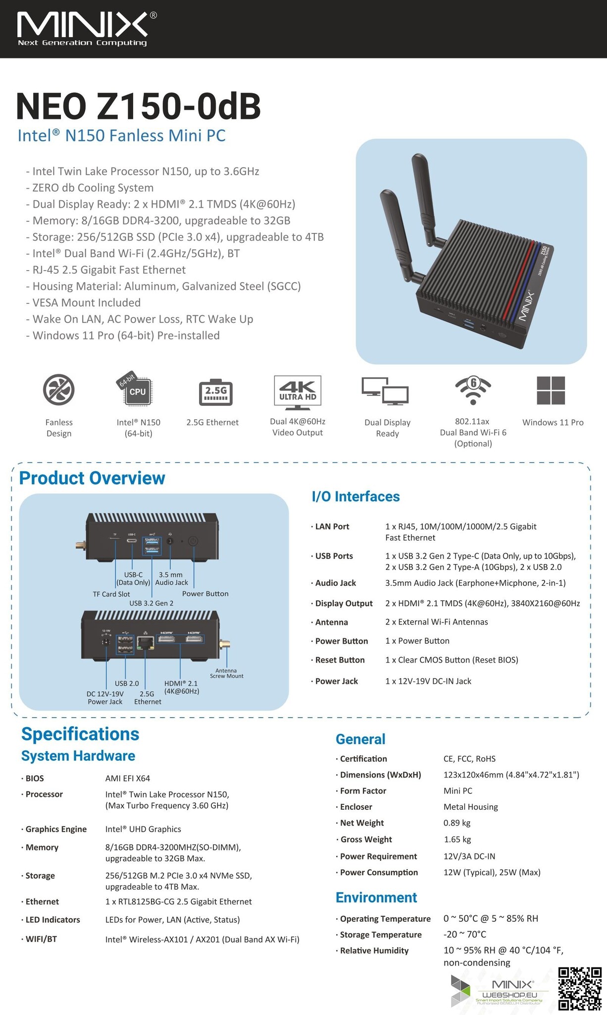 Specification MINIX Z150-0dB 8GB/256GB Intel N150 Fanless Mini PC