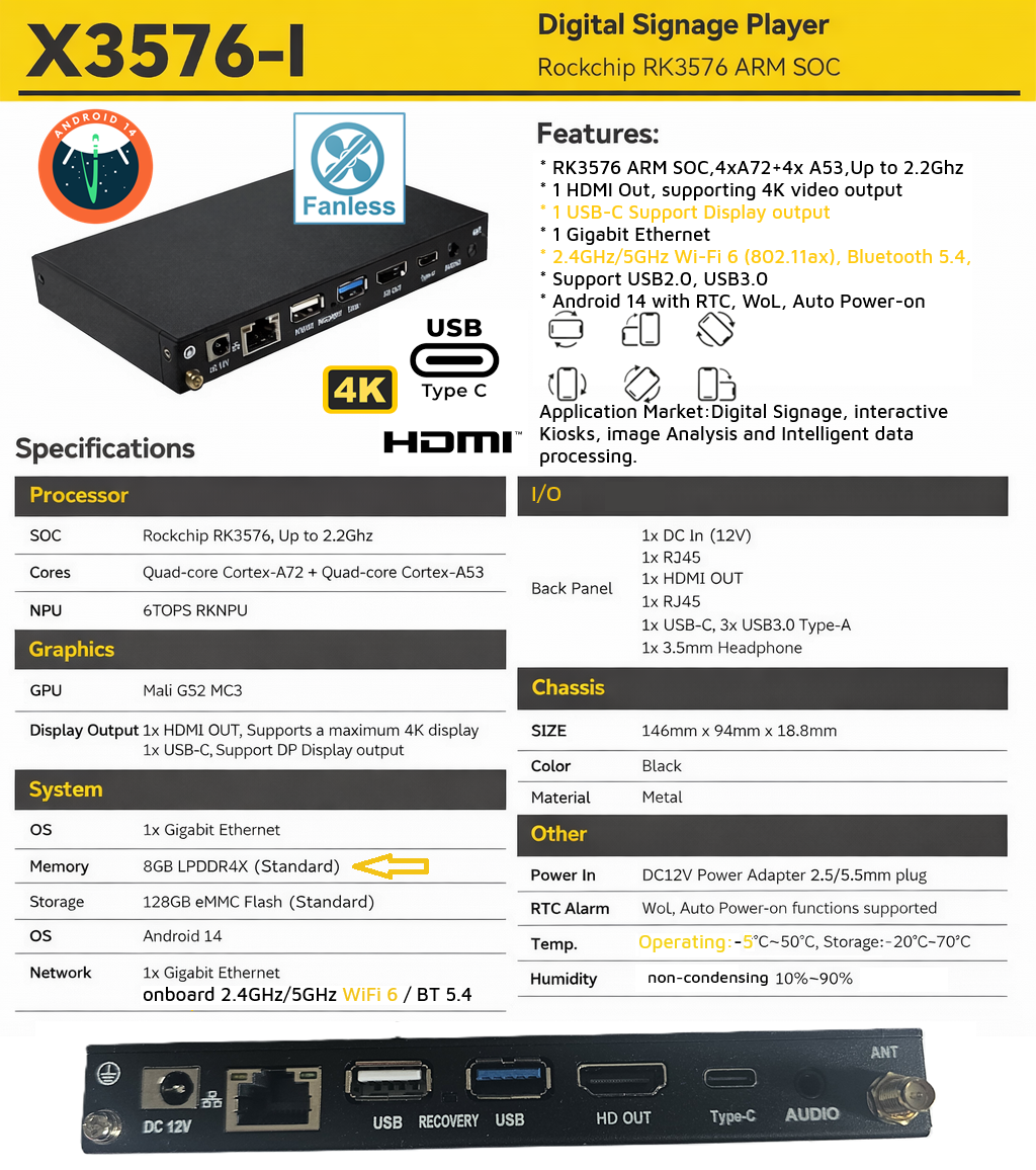 Smart Import Solutions X3576-i RK3576 Android 14. 8GB/128GB kiosk / digital signage player