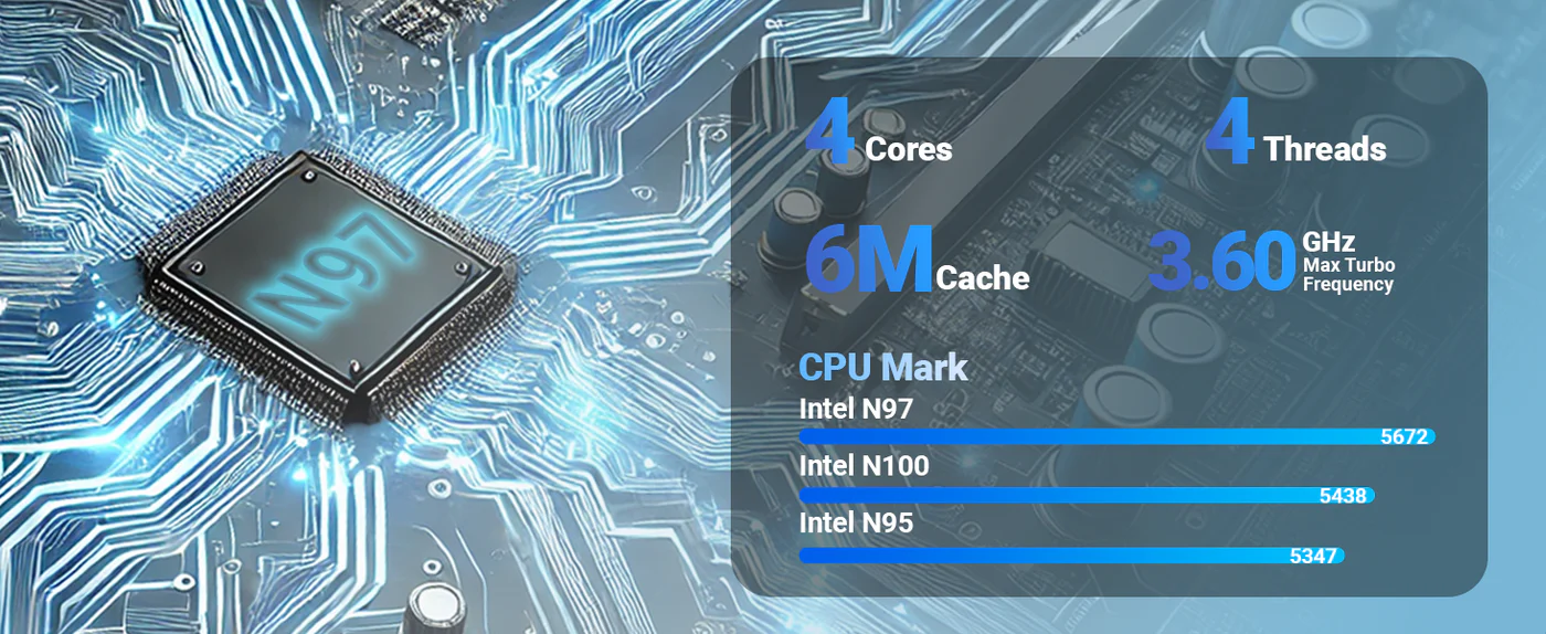 CPU: Intel® Processor N97 (6MB cache, up to 3.6 GHz) |