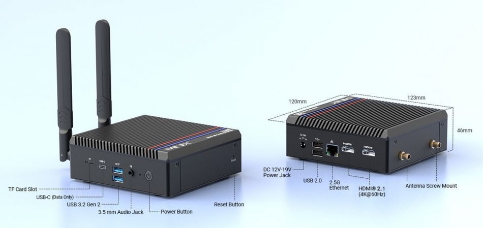 LAN Port: 1 x RJ45, 2.5 Gigabit Fast Ethernet USB Ports :1 x USB 3.2 Gen 2 Type-C (Data Only, up to 10Gbps), 2 x USB 3.2 Gen 2 Type-A (10Gbps), 2 x USB 2.0 Audio Jack: 3.5mm Audio Jack (Earphone+Micphone, 2-in-1) Display Output: 2 x HDMI® 2.1 TMDS (4K@60Hz), 3840X2160@60Hz Antenna: 2 x External Wi-Fi Antennas Power Button: 1 x Power Button Reset Button: 1 x Clear CMOS Button (Reset BIOS) Power Jack: 1 x 12V-19V DC-IN Jack
