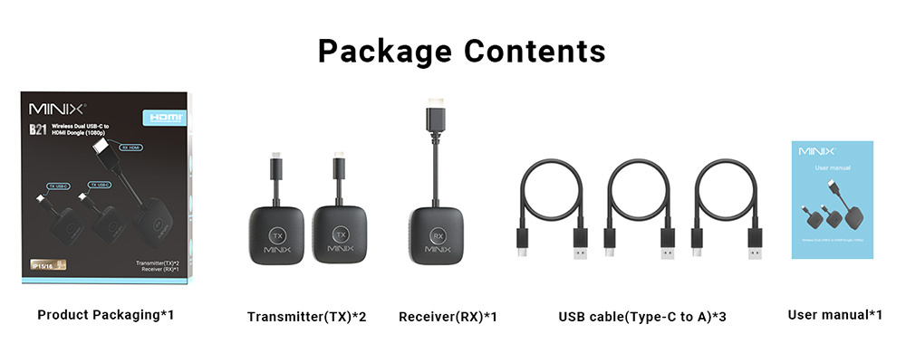 2 × zender (TX) 1 × ontvanger (RX) 1 × USB-kabel (Type-C naar A) 1 × Gebruikershandleiding |