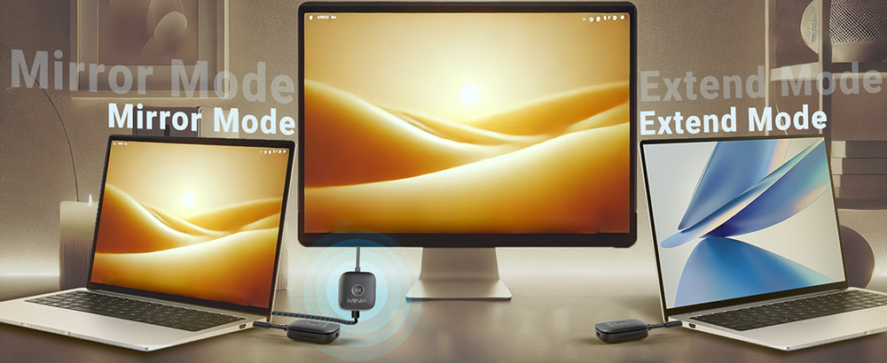 De MINIX NEO B21 2-naar-1 draadloze display dongle biedt een indrukwekkende functie waarmee je tegelijkertijd verbinding kunt maken met meerdere apparaten. Je kunt je scherm moeiteloos spiegelen of uitbreiden naar televisies en projectoren, waardoor het perfect is voor presentaties, streaming of gaming.
